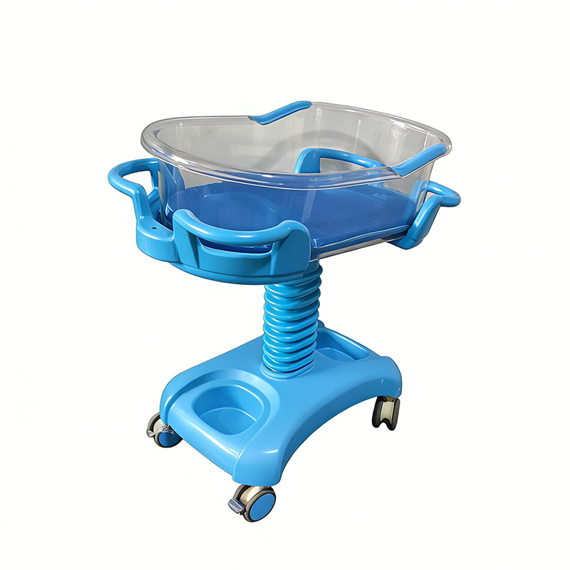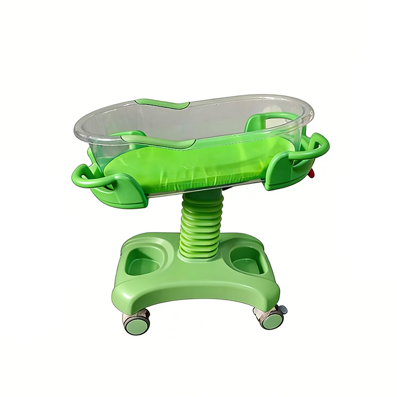 This ABS baby cot features adjustable height and 0–12° tilt for infant comfort. It includes smooth-rolling casters and a stable design. Ideal for hospitals and maternity care use.