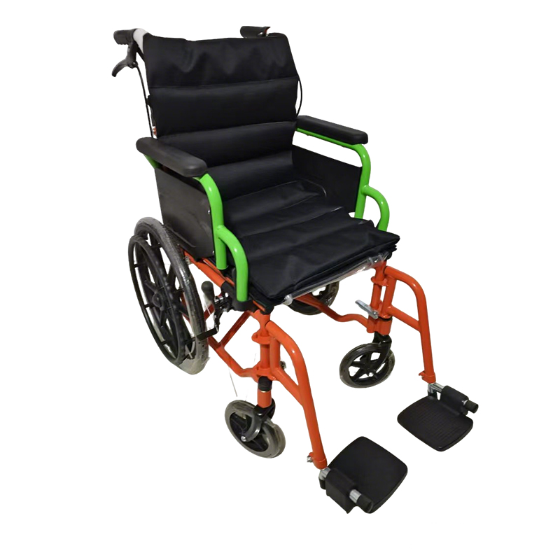 This colorful pediatric small wheelchair is designed for safe and comfortable daily use by children. The carbon steel frame provides stable support. The compact folding design makes transport easy. Flip-up armrests and detachable front legs improve daily handling. The two-tone appearance adds a friendly and child-focused look.